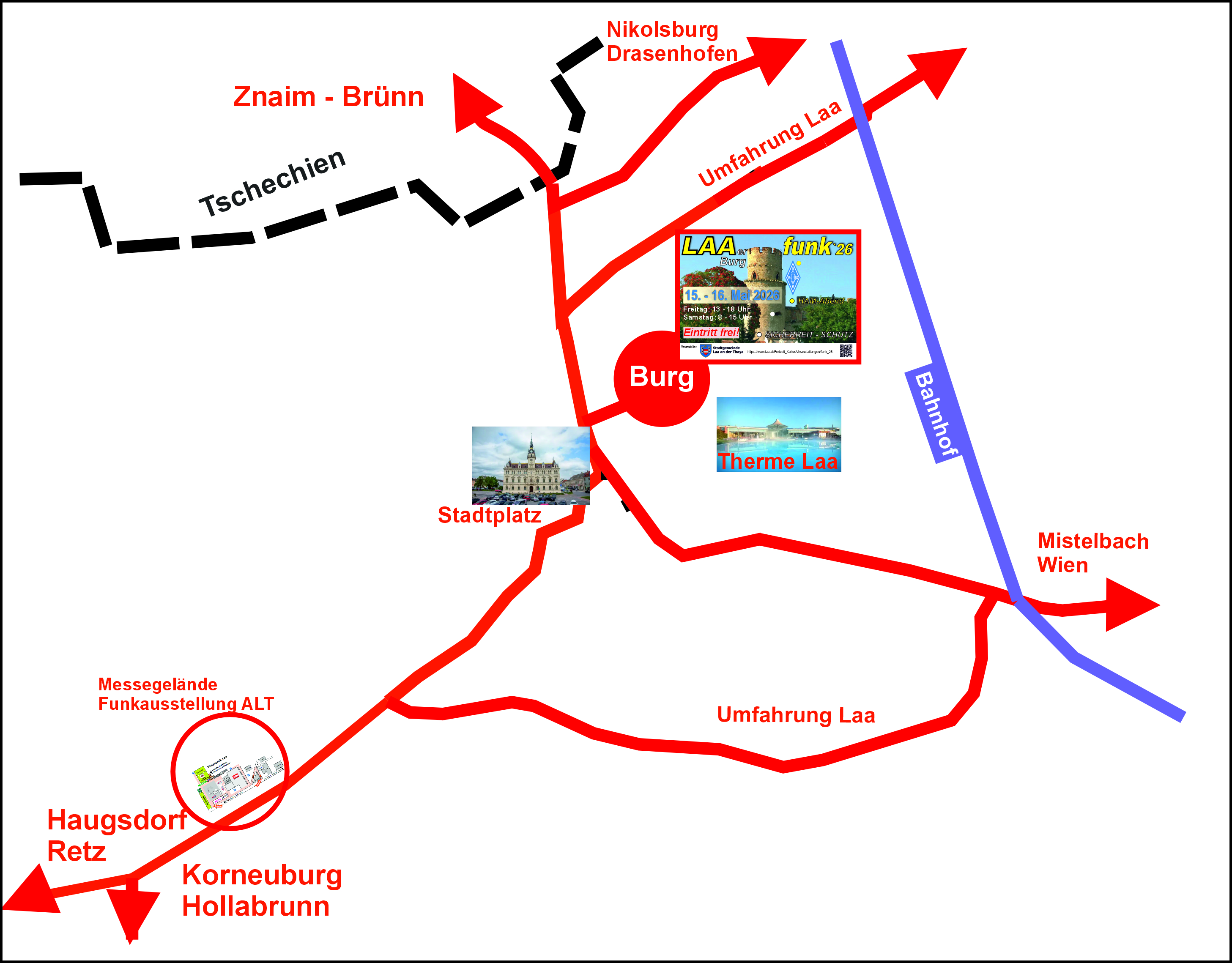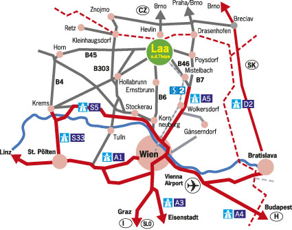 - Von Stockerau kommend auf der A22 in Richtung Korneuburg. Abfahrt Korneuburg West über die B6 über Ernstbrunn nach Laa an der Thaya